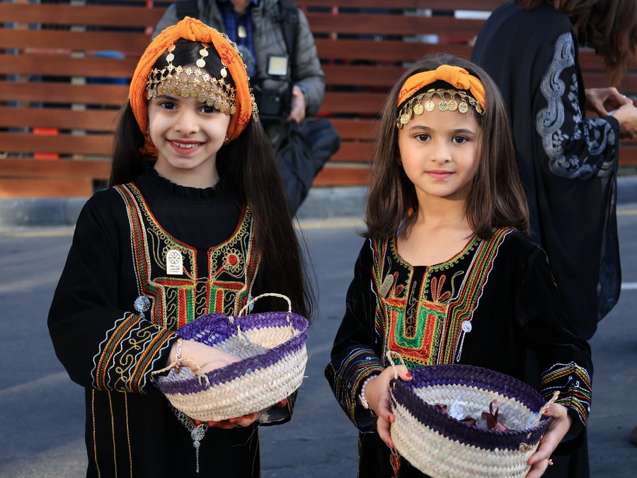Photo taken on Feb. 22, 2022 shows the Saudi girls wearing traditional abaya and headwear to attend the first kingdom's founding day celebration events in Abha, Saudi Arabia.(Xinhua/Wang Haizhou)