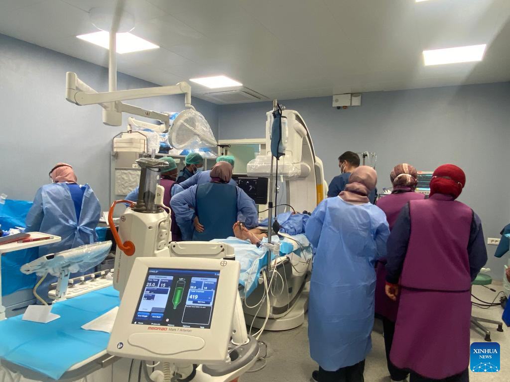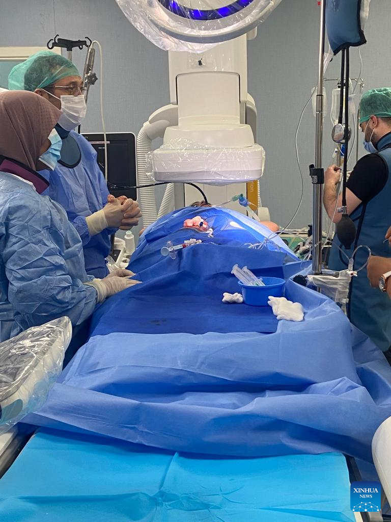Medical staff perform a surgery at an operating room in Tripoli, Libya, Feb. 22, 2022. A British medical team has started performing heart surgeries in the Libyan capital Tripoli for children, a local medical official said on Tuesday. (Photo by Hamza Turkia/Xinhua)