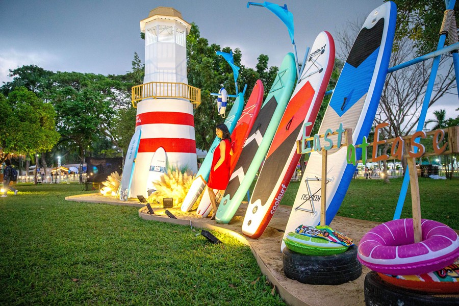 A visitor poses for photos with the miniature of a lighthouse during the 40th Thailand Tourism Festival at Lumpini Park in Bangkok, Thailand, Feb. 22, 2022. (Xinhua/Wang Teng)
