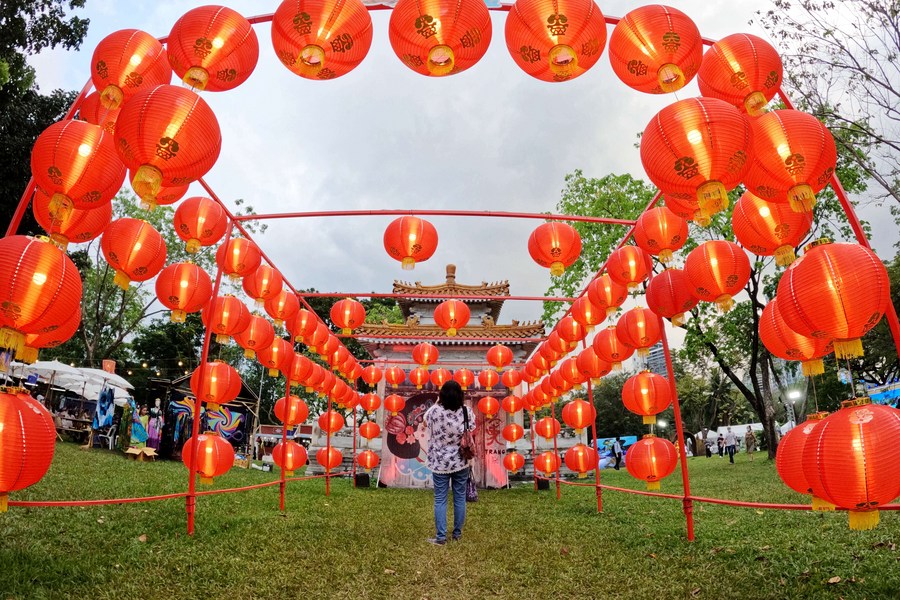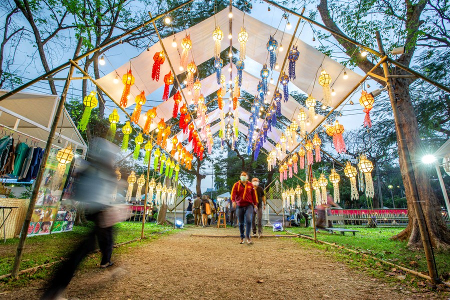 Tourists walk through a corridor decorated with lanterns during the 40th Thailand Tourism Festival at Lumpini Park in Bangkok, Thailand, Feb. 22, 2022. (Xinhua/Wang Teng)