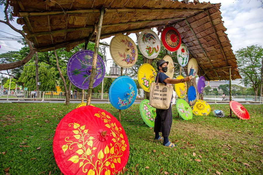 A visitor takes selfies with paper umbrellas during the 40th Thailand Tourism Festival at Lumpini Park in Bangkok, Thailand, Feb. 22, 2022. (Xinhua/Wang Teng)