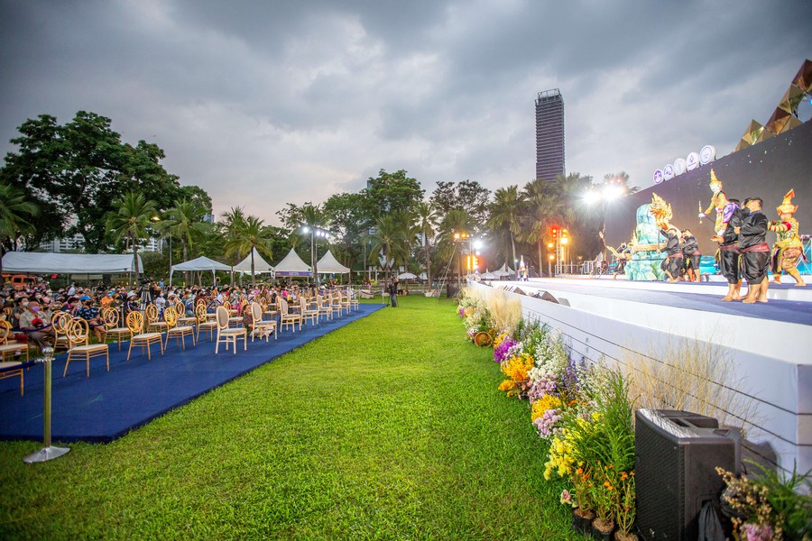 People watch a traditional Thai dance during the 40th Thailand Tourism Festival at Lumpini Park in Bangkok, Thailand, Feb. 22, 2022. (Xinhua/Wang Teng)■