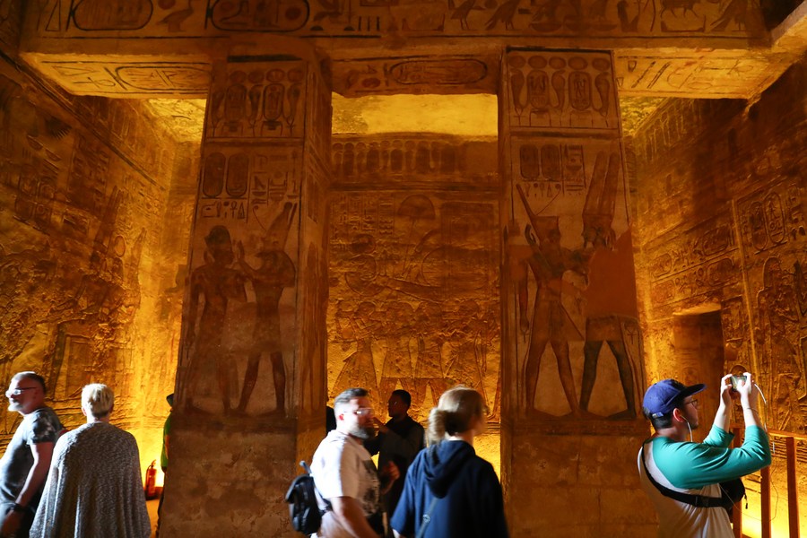 Tourists visited the ancient rock-cut Abu Simbel temple in southern Egypt's Aswan on Feb. 22, 2022. (Xinhua/Sui Xiankai)■