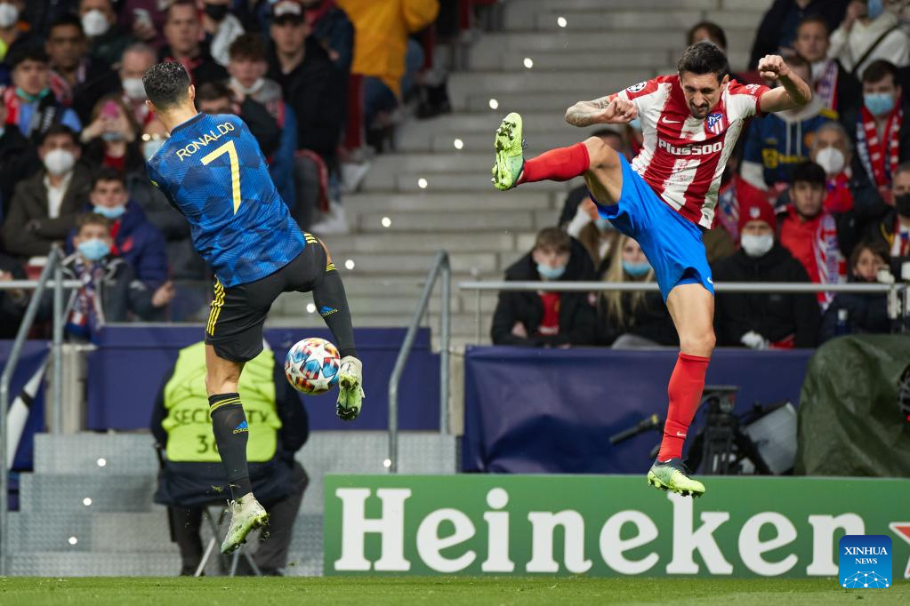 Atletico de Madrid's Stefan Savic (R) vies with Manchester United's Cristiano Ronaldo during the UEFA Champions League round of 16 first leg match between Atletico de Madrid and Manchester United in Madrid, Spain, Feb.23, 2022. (Xinhua/Meng Dingbo)