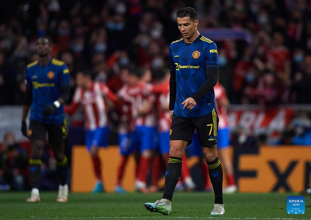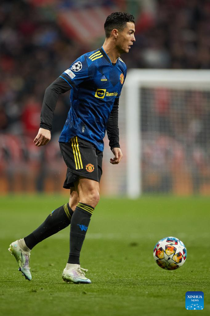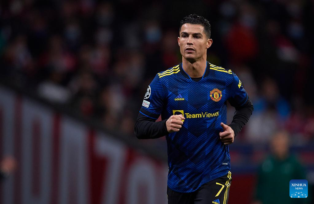 Manchester United's Cristiano Ronaldo competes during the UEFA Champions League round of 16 first leg match between Atletico de Madrid and Manchester United in Madrid, Spain, Feb.23, 2022. (Xinhua/Meng Dingbo)