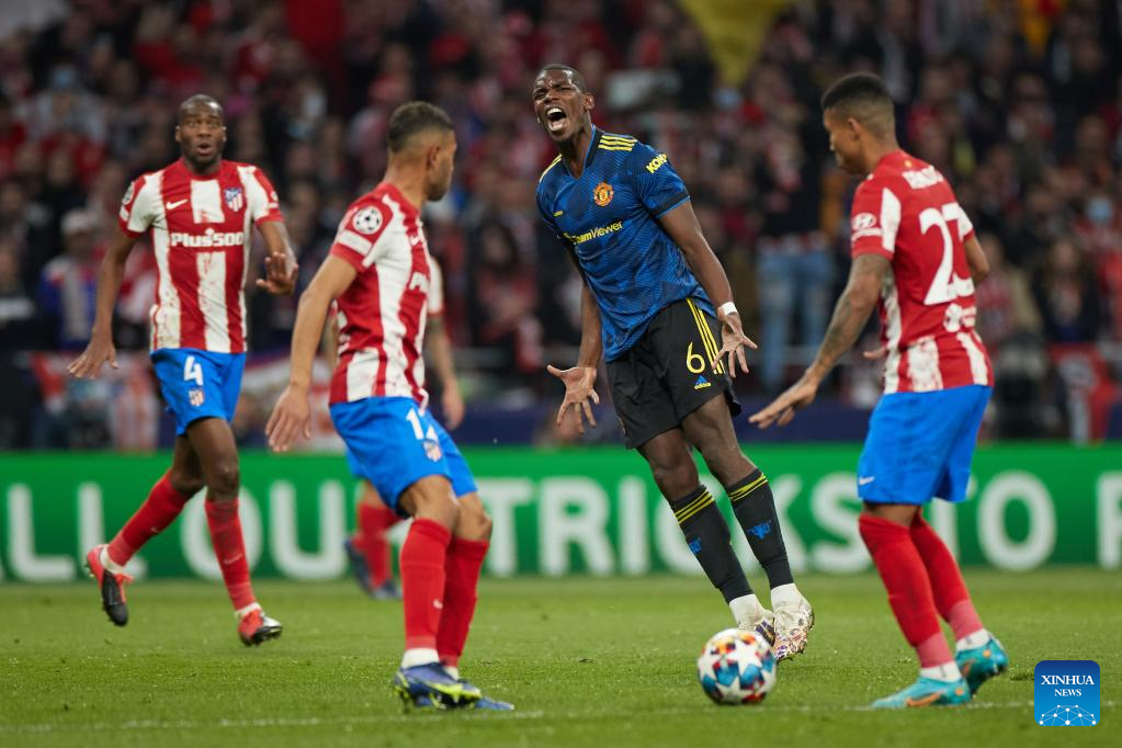 Manchester United's Paul Pogba (2nd R) reacts during the UEFA Champions League round of 16 first leg match between Atletico de Madrid and Manchester United in Madrid, Spain, Feb.23, 2022. (Xinhua/Meng Dingbo)