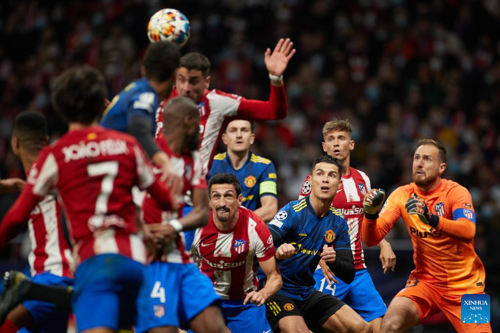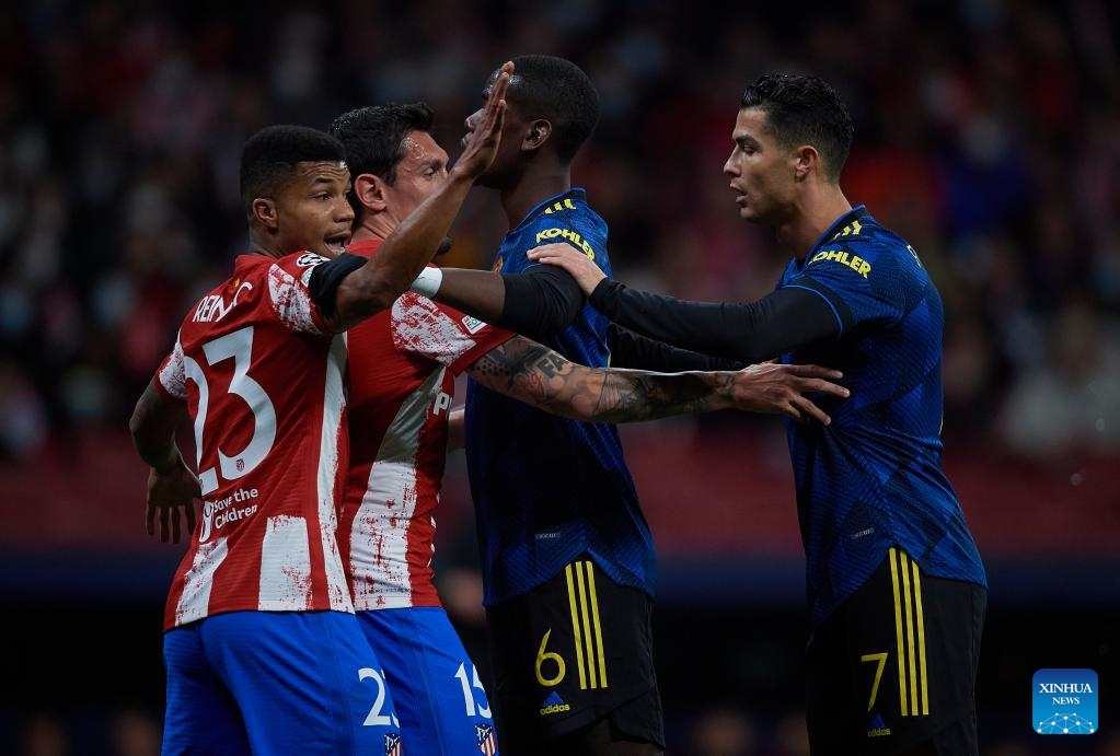 Players of both teams vie for the ball during the UEFA Champions League round of 16 first leg match between Atletico de Madrid and Manchester United in Madrid, Spain, Feb.23, 2022. (Xinhua/Meng Dingbo)