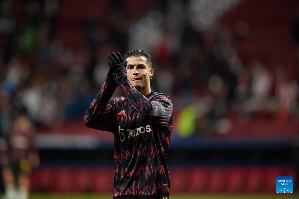 Manchester United's Cristiano Ronaldo greets to fans before the UEFA Champions League round of 16 first leg match between Atletico de Madrid and Manchester United in Madrid, Spain, Feb.23, 2022. (Xinhua/Meng Dingbo)
