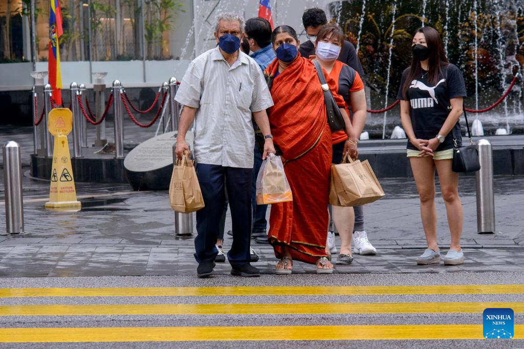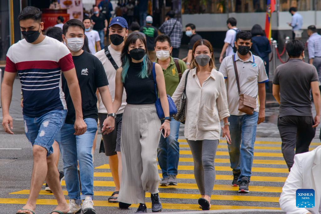 People wearing face masks walk across a street in Kuala Lumpur, Malaysia, Feb. 24, 2022. Malaysia reported 31,199 new COVID-19 infections in the highest daily spike as of midnight Wednesday, bringing the national total to 3,305,157, according to the health ministry. (Photo by Chong Voon Chung/Xinhua)