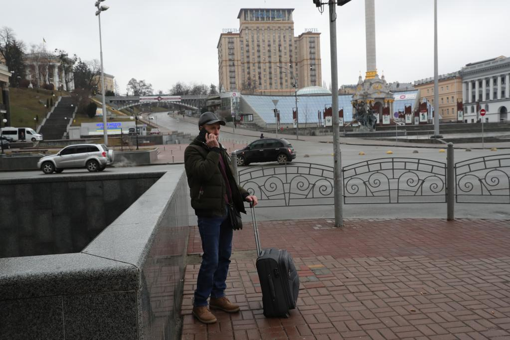 A citizen makes a phone call at the entrance of a metro station near the Independence Square in Kiev, Ukraine, Feb. 24, 2022.