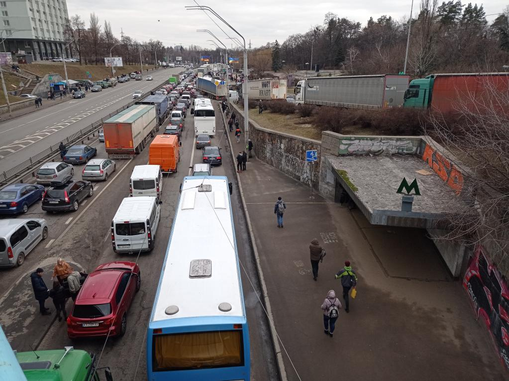 Photo taken on Feb. 24, 2022 shows long lines of vehicles heading out of the city in Kiev, Ukraine. Ukrainian President Volodymyr Zelensky on Thursday declared martial law in the country after Russia started a military operation against Ukraine. (Photo by Sergey Starostenko/Xinhua)