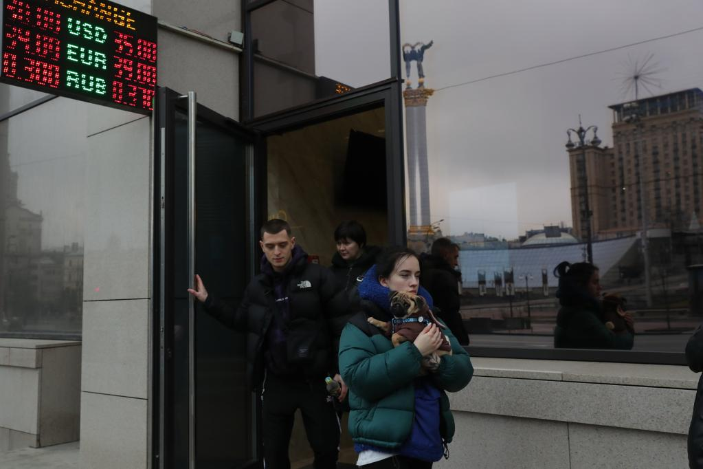 Citizens leave a money exchange in Kiev, Ukraine, Feb. 24, 2022. Ukrainian President Volodymyr Zelensky on Thursday declared martial law in the country after Russia started a military operation against Ukraine. In a video address, Zelensky said his country is under attack. According to the Interior Ministry, military depots and airfields in the capital were hit by missiles. (Xinhua/Li Dongxu)