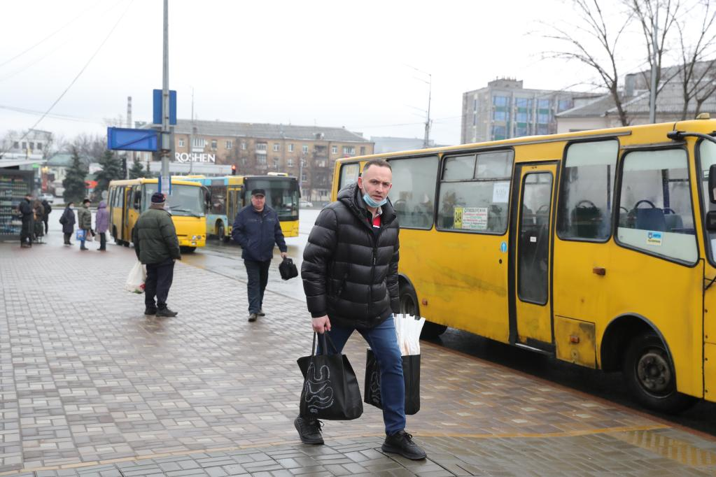 A citizen prepares to board a bus after buying daily necessities in Kiev, Ukraine, Feb. 24, 2022.