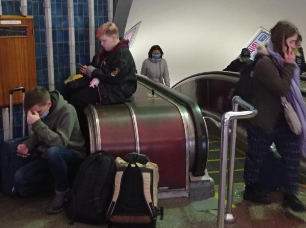 Photo taken on Feb. 24, 2022 shows residents preparing to take a subway in Kiev, Ukraine. Ukrainian President Volodymyr Zelensky on Thursday declared martial law in the country after Russia started a military operation against Ukraine. (Photo by Sergey Starostenko/Xinhua)