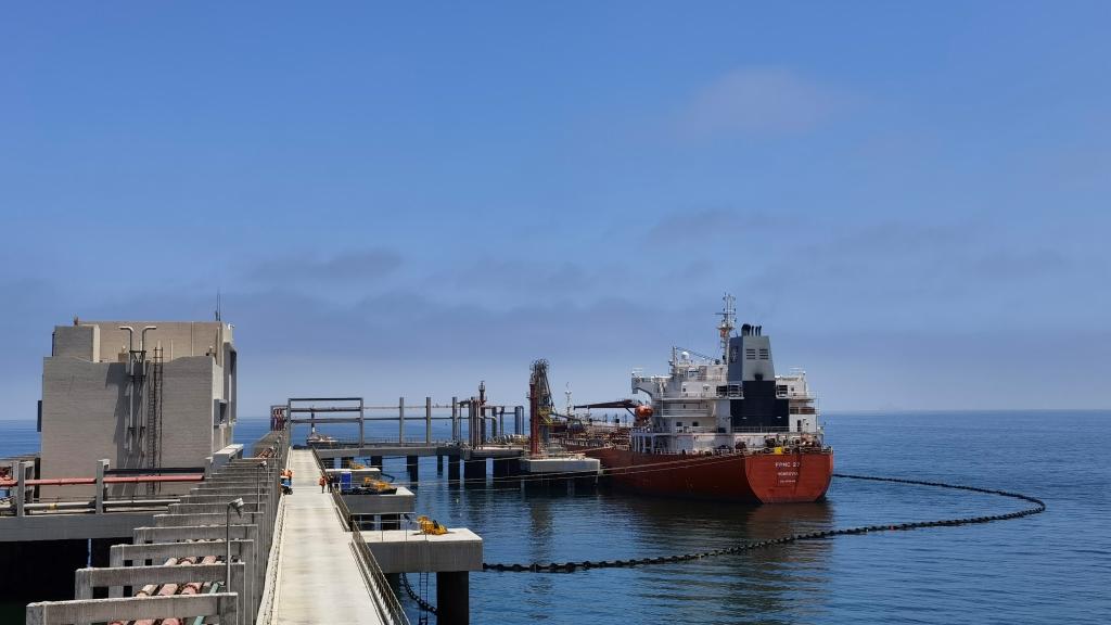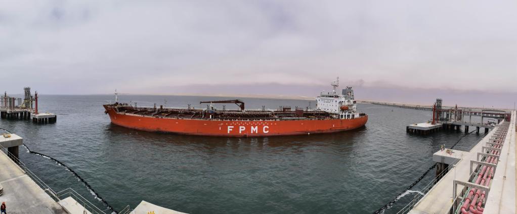 This file photo shows an oil tanker unloads oil at a terminal in Namibia's port town Walvis Bay on Dec. 1, 2020. (Xinhua/Huo Kecheng)