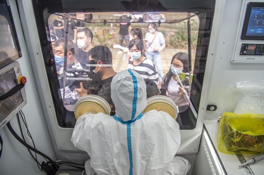A medical worker works in a mobile lab for COVID-19 nucleic acid testing in Wuchang District of Wuhan, central China's Hubei Province, Aug. 5, 2021. (Photo by Wu Zhizun/Xinhua)