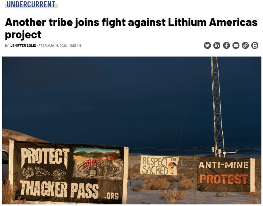 The screenshot taken from the website of Nevada Current, a nonprofit online source of political and policy news and commentary, on Feb. 24, 2022 shows its recent article and picture that list the Winnemucca Indian Colony as the third Native American tribe seeking to join litigation against the lithium mine proposed by Lithium Americas, along with the Reno-Sparks Indian Colony and Burns Paiute Tribe who joined last year. (Xinhua)