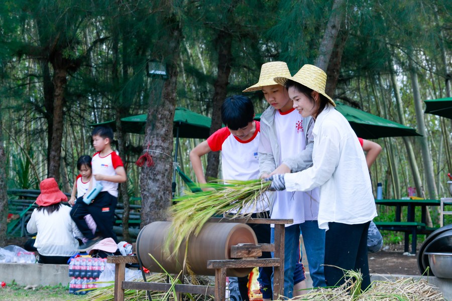 Wu Shaoyu (1st, R) displays the production process of Hainan traditional sugar-making craft as she records a video in Xuelan Village in Danzhou, south China's Hainan Province, Nov. 6, 2021. (Xinhua)