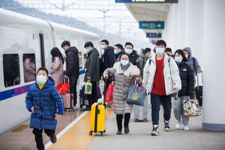 Passengers board a train in Duchang Railway Station in Duchang County, east China's Jiangxi Province, Feb. 6, 2022. (Photo by Fu Jianbin/Xinhua)
