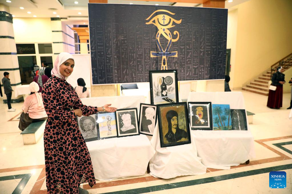 Zainab Abdel-Rahim, a 30-year-old woman with deafness, displayed her charcoal paintings of dark-skinned female faces symbolizing Aswan women. Her works also include an oil painting featuring the iconic Philae temple complex in Aswan.