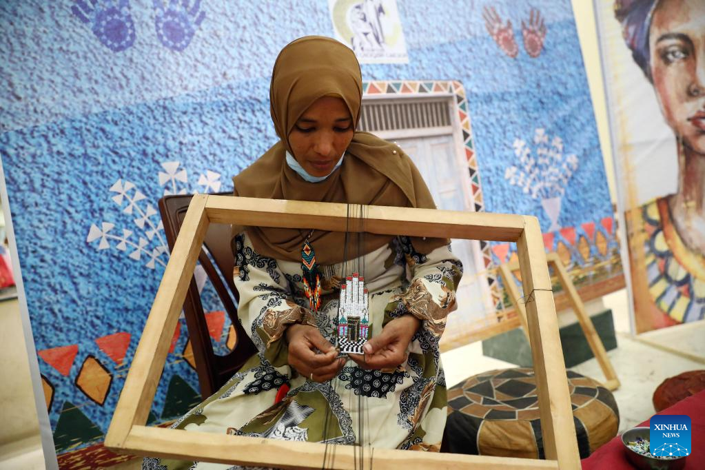 A craftswoman strings beads during a handmade products exhibition on the sidelines of a women film festival in Aswan, Egypt on Feb. 24, 2022. A variety of colorful crocheted items like teddy bears, coasters, handbags, hats, scrunchies, vases with heart-shaped flowers and much more, are displayed in a hall during a handmade products exhibition in Upper Egypt's charming city of Aswan. (Xinhua/Ahmed Gomaa)