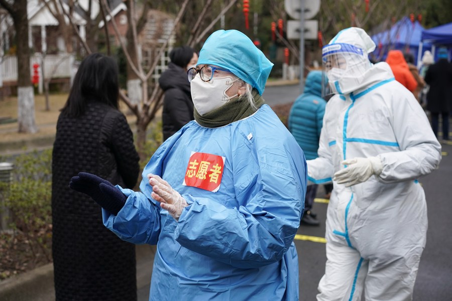 Ellen Touchstone (front) works at a COVID-19 testing site in the Suzhou Industrial Park in Suzhou, east China's Jiangsu Province, Feb. 18, 2022. (Xinhua/Ji Chunpeng)