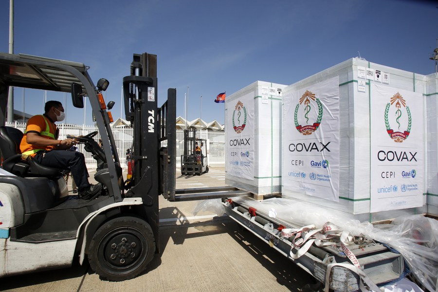 An airport worker transports packages of Chinese-made Sinovac COVID-19 vaccine through the COVAX at the Phnom Penh International Airport in Phnom Penh, Cambodia, Dec. 13, 2021. (Photo by Sovannara/Xinhua)