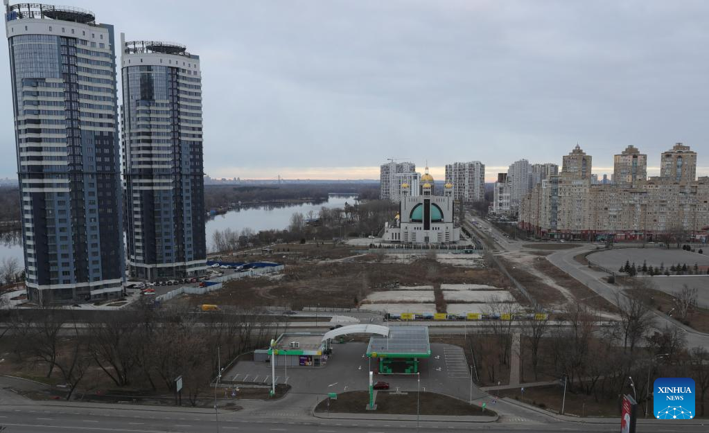 Photo taken on Feb. 26, 2022 shows a night view in Kiev, capital of Ukraine. (Xinhua/Li Dongxu)
