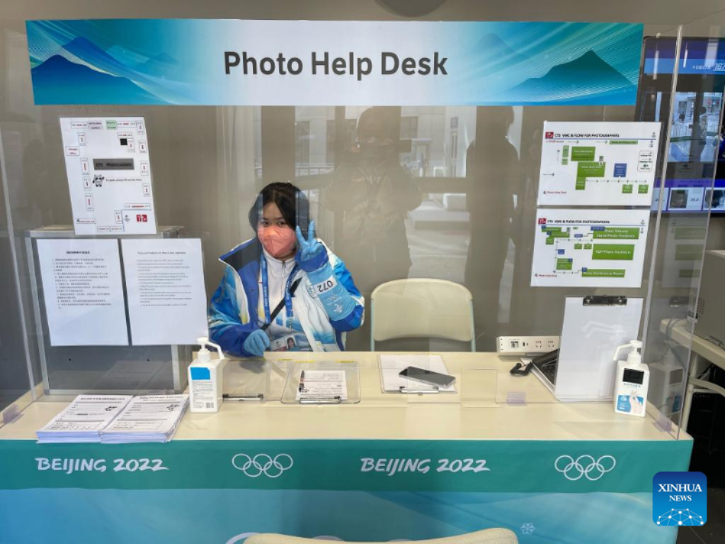 Yang Dijingwen, a Chinese student of Turkish, poses for a photo at photo help desk at Capital Indoor Stadium while volunteering in Beijing Winter Olympics in Beijing, capital of China, Jan. 29, 2022. (Xinhua)