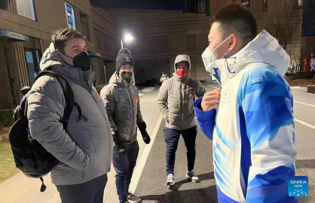 Guan Bo (1st R), a teacher of Turkish at the Beijing Foreign Studies University, greets some Turkish Olympic team members while volunteering in Beijing Winter Olympics in Beijing, capital of China, Feb. 2, 2022. (Xinhua)