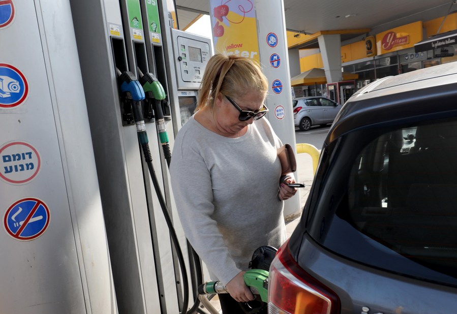 A woman holds a a pump nozzle labelled "Super 95" to refuel her car at a fuel station in Tzemach near the northern Israeli city of Tiberias on Feb. 28, 2022. (Photo by Gil Cohen Magen/Xinhua)
