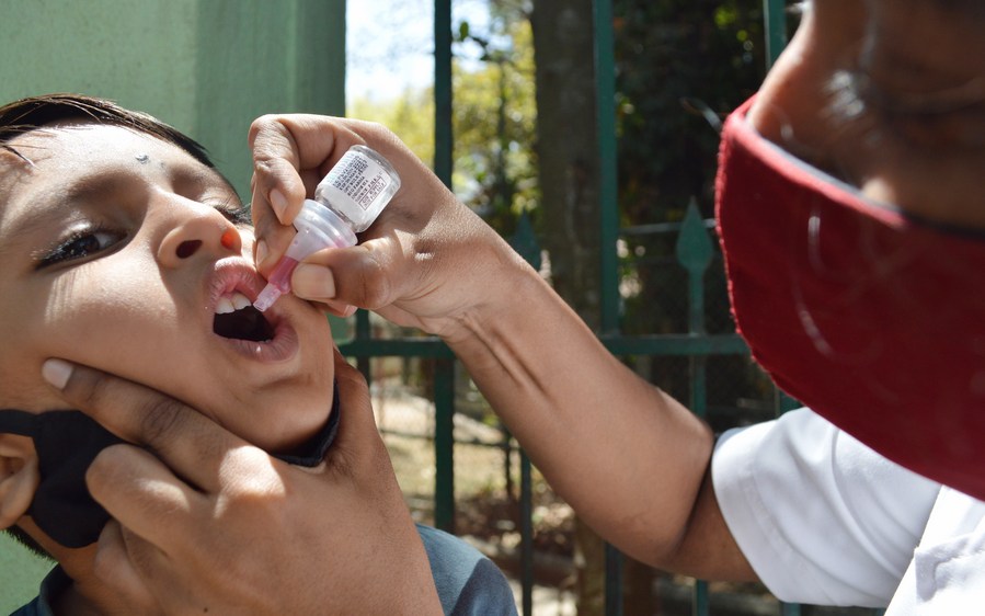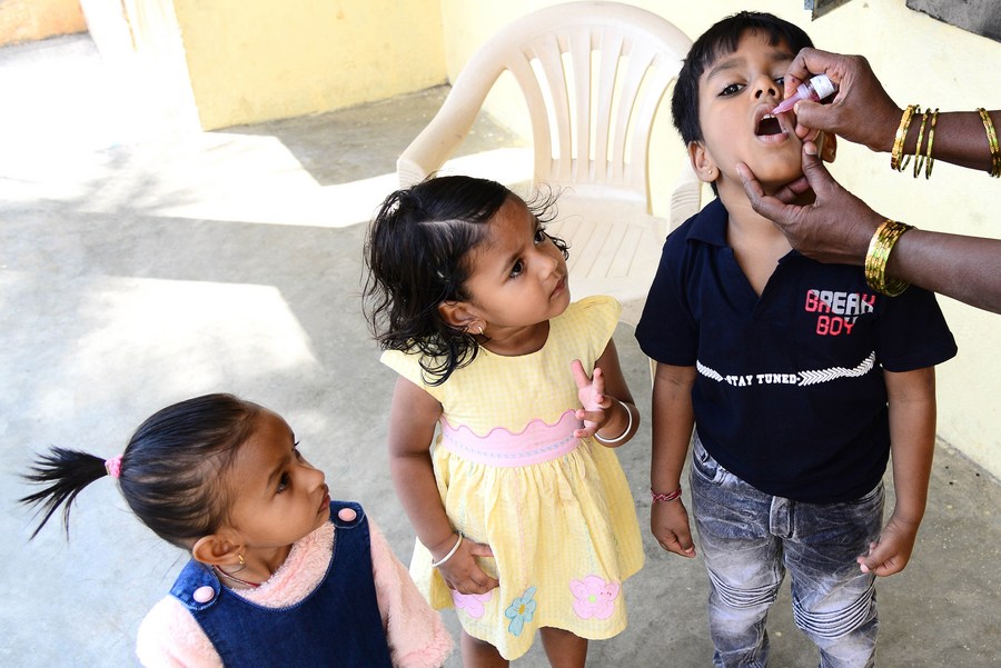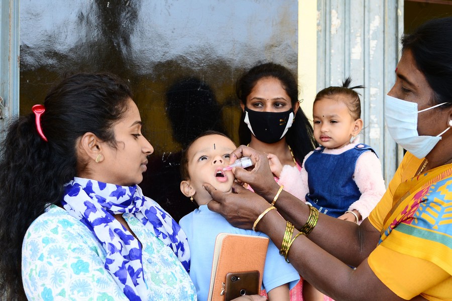 An Indian medical volunteer administers a dose of polio vaccine to a child as part of the Indian National Pulse Polio Immunisation Programme in Bangalore, India, Feb. 27, 2022. (Xinhua/Stringer)