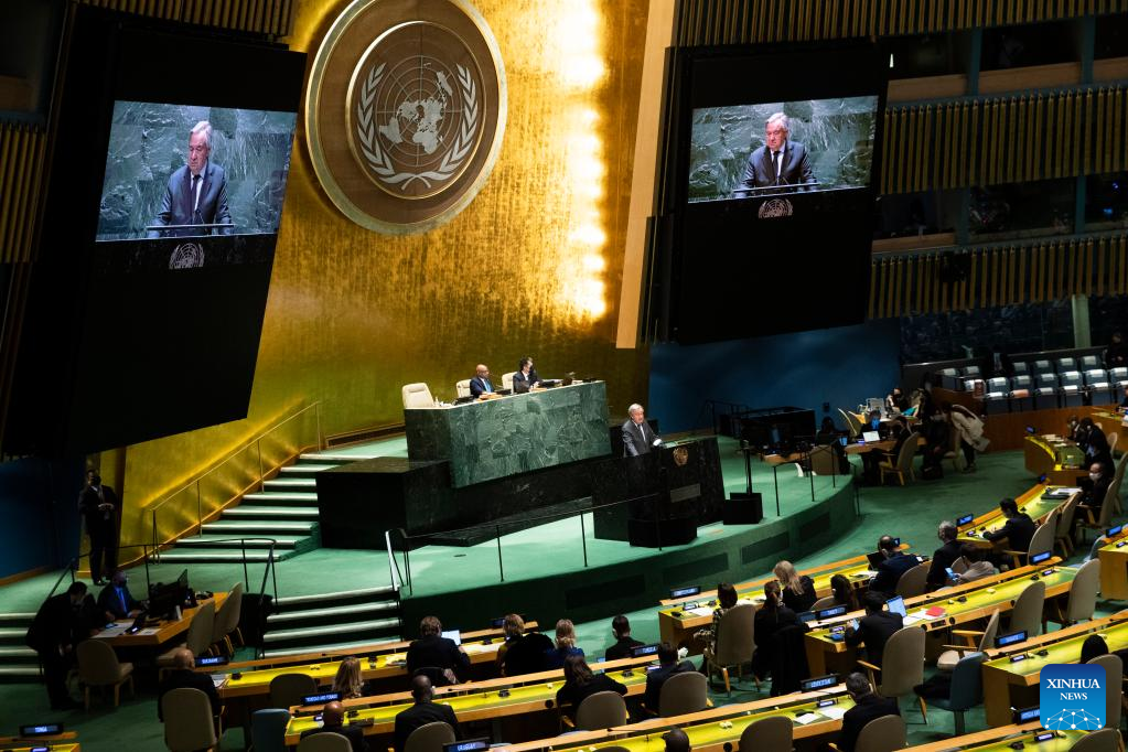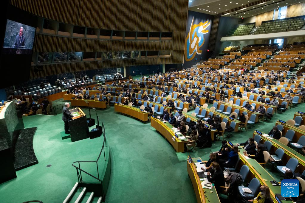 UN Secretary-General Antonio Guterres (on the podium) speaks during an emergency special session of the UN General Assembly on Ukraine, at the UN headquarters in New York, on Feb. 28, 2022. Guterres on Monday called for an immediate end to the military operations in Ukraine. (Xinhua/Wang Ying)