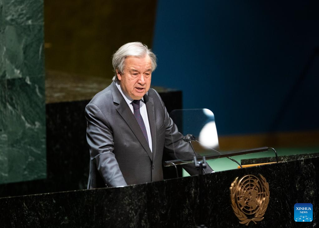 UN Secretary-General Antonio Guterres speaks during an emergency special session of the UN General Assembly on Ukraine, at the UN headquarters in New York, on Feb. 28, 2022. Guterres on Monday called for an immediate end to the military operations in Ukraine. (Xinhua/Wang Ying)