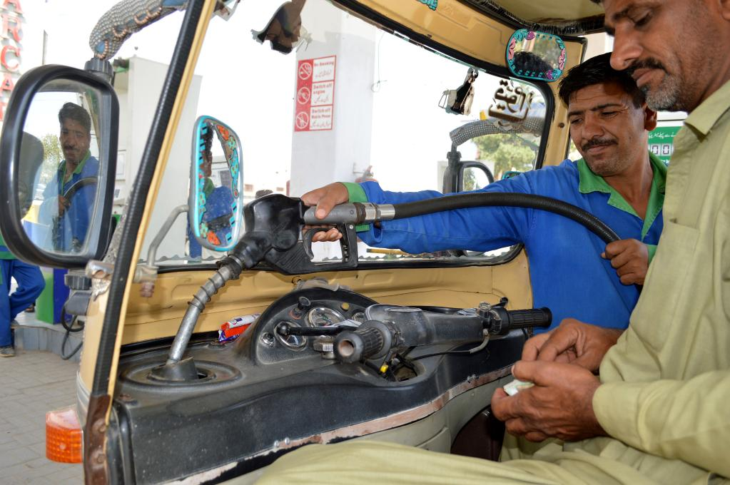 An employee fills tank of an auto-rickshaw at a fuel station in southern Pakistani port city of Karachi on March 1, 2022. Pakistani Prime Minister Imran Khan on Monday announced relief and incentives for the public as a respite in the ongoing wave of inflation and price hike in the country. (Str/Xinhua)