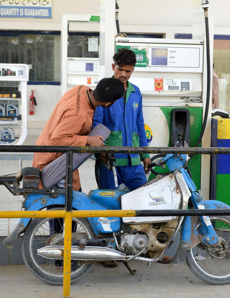 An employee fills tank of a motorbike at a fuel station in southern Pakistani port city of Karachi on March 1, 2022. Pakistani Prime Minister Imran Khan on Monday announced relief and incentives for the public as a respite in the ongoing wave of inflation and price hike in the country. (Str/Xinhua)