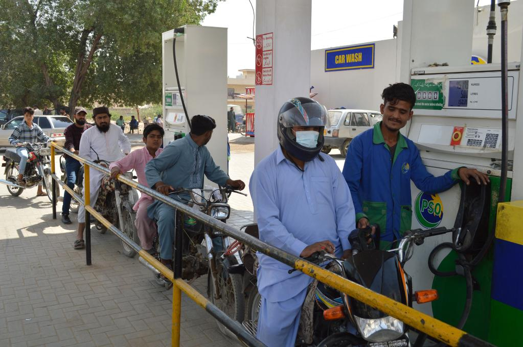 People line up to get their motorbike tanks filled at a fuel station in southern Pakistani port city of Karachi on March 1, 2022. Pakistani Prime Minister Imran Khan on Monday announced relief and incentives for the public as a respite in the ongoing wave of inflation and price hike in the country. (Str/Xinhua)