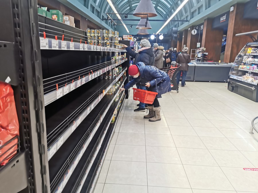 Photo taken on Feb. 28, 2022 shows some empty shelves in a supermarket in Lviv, Ukraine. (Xinhua/Chen Wenxian)
