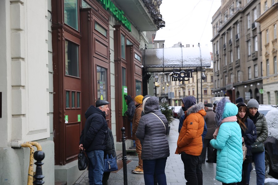 Photo taken on Feb. 28, 2022 shows people queueing up outside a bank in Lviv, Ukraine. (Xinhua/Chen Wenxian)