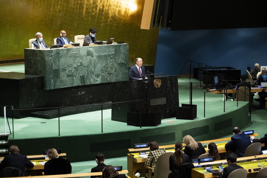 Zhang Jun (on the podium), China's permanent representative to the United Nations, speaks during an emergency special session of the UN General Assembly on Ukraine, at the UN headquarters in New York, on Feb. 28, 2022. (Xinhua/Wang Ying)