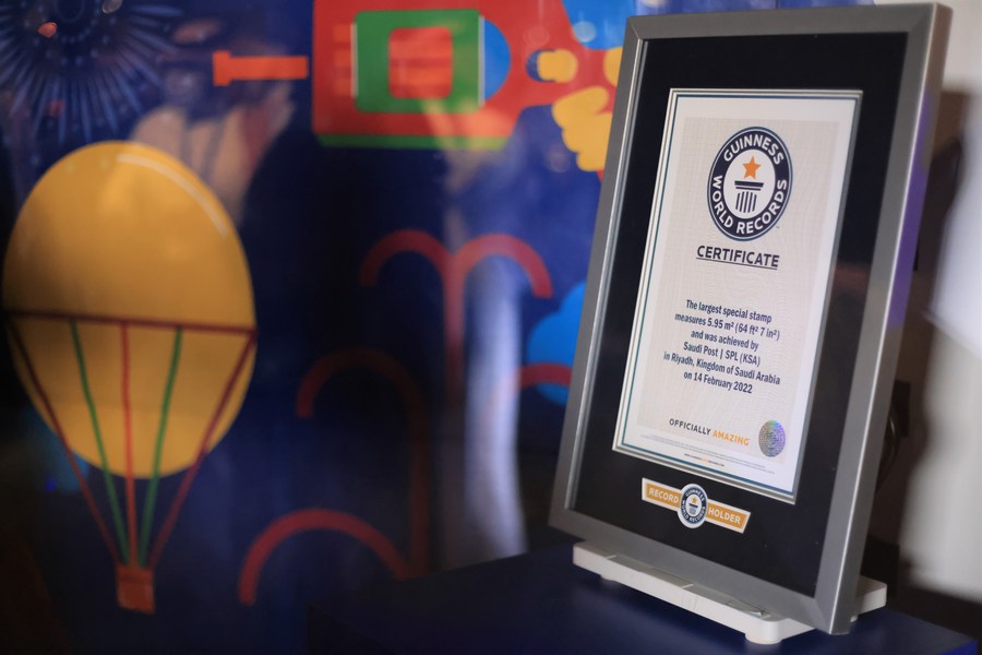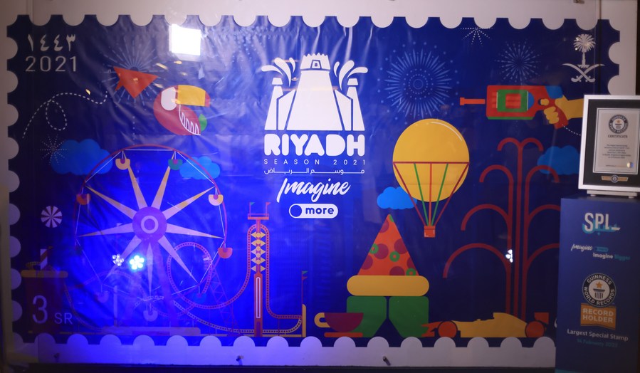 Photo taken on February. 28, 2022 shows the special Riyadh Season stamp that set a new Guinness World Record, at the Riyadh Season Boulevard, in Riyadh, Saudi Arabia. (Xinhua/Wang Haizhou)