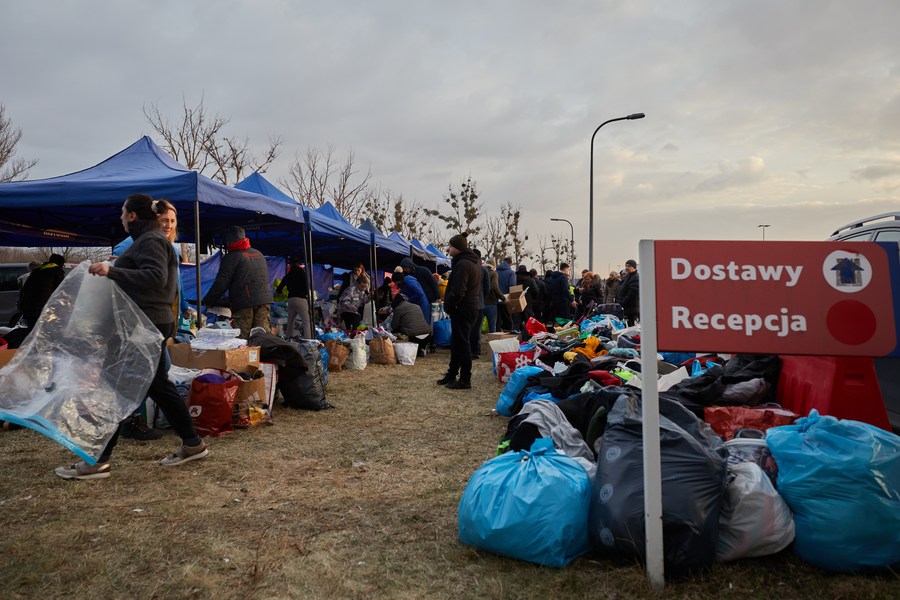 Photo taken on Feb. 26, 2022 show a temporary resettlement site for people from Ukraine, in Przemysl, Poland. (Xinhua/Meng Dingbo)