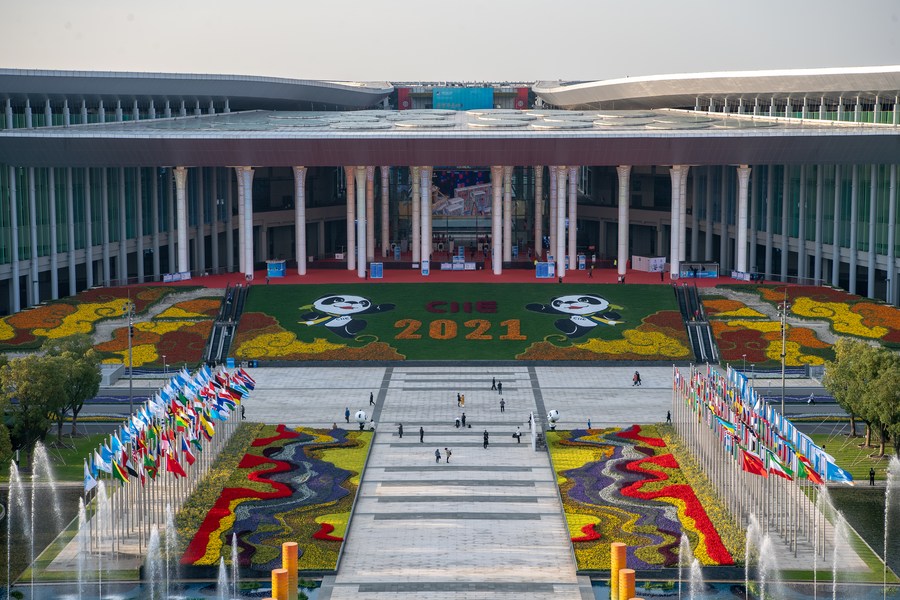 Photo taken on Nov. 9, 2021 shows a view of the south square of the National Exhibition and Convention Center (Shanghai), the main venue for the 4th China International Import Expo (CIIE), in east China's Shanghai. (Xinhua/Wu Huiwo)