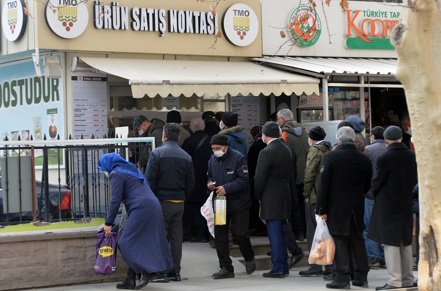 People queue to buy fair-price olive oil at an outlet of the Agricultural Products Office in Ankara, Turkey on Feb. 17, 2022. (Photo by Mustafa Kaya/Xinhua)
