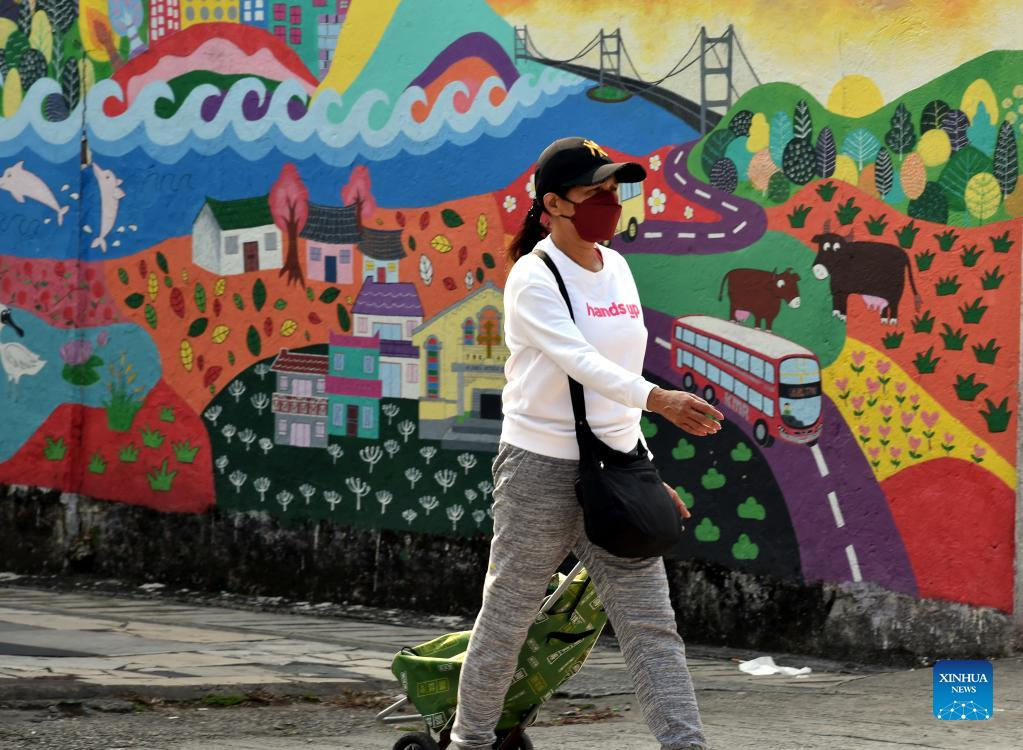 A citizen wearing a face mask walks on a street in Hong Kong, south China, March 2, 2022. Hong Kong reported 55,353 new COVID-19 cases and 117 deaths on Wednesday, official data showed. (Xinhua/Lo Ping Fai)