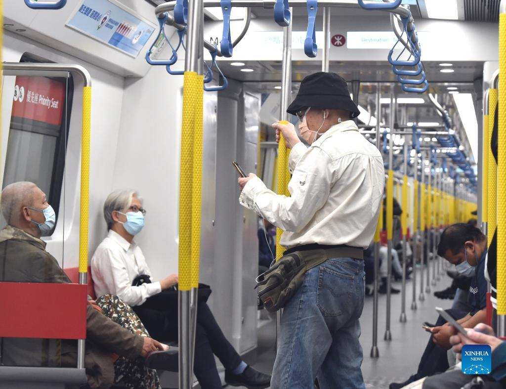 Citizens wearing face masks take the subway in Hong Kong, south China, March 2, 2022. Hong Kong reported 55,353 new COVID-19 cases and 117 deaths on Wednesday, official data showed. (Xinhua/Lo Ping Fai)