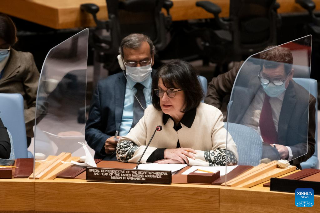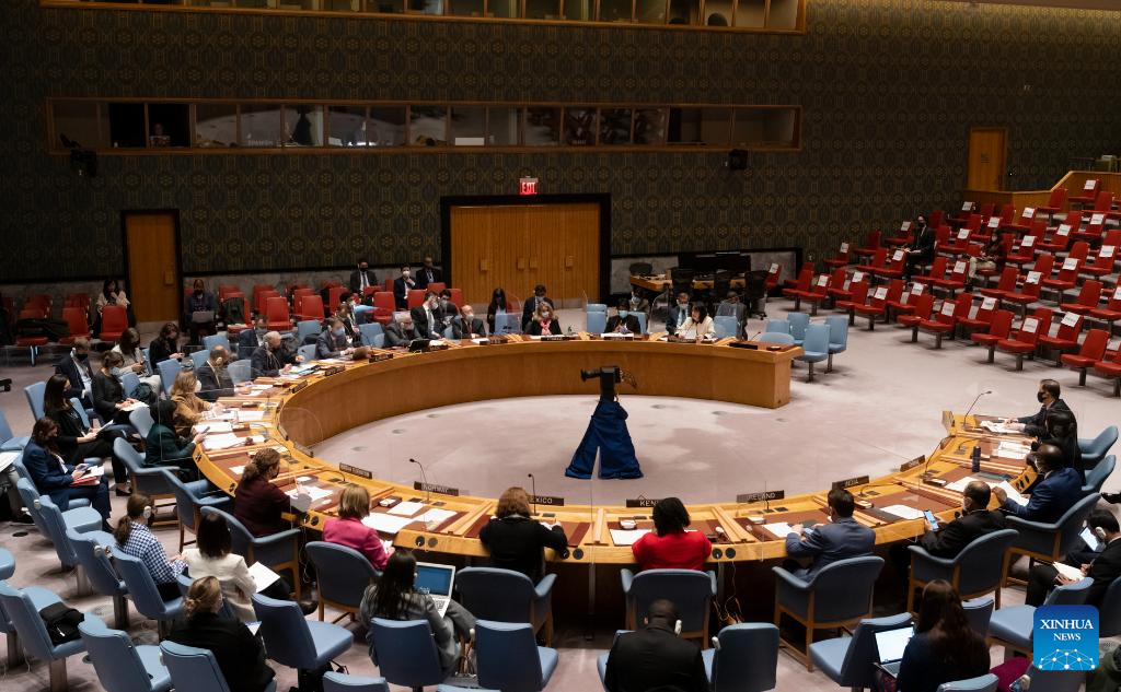 Photo taken on March 2, 2022 show the scene of a Security Council meeting on Afghanistan at UN Headquarters in New York. The international community has no choice but to deal with the Taliban in Afghanistan, said Deborah Lyons, the top UN envoy for the war-torn country, on Wednesday. (Mark Garten/UN Photo/Handout via Xinhua)