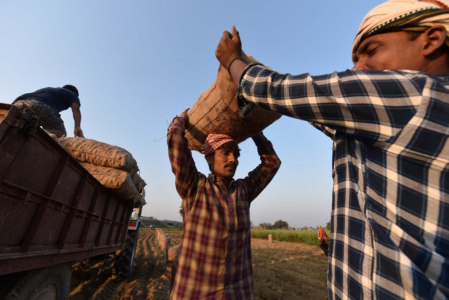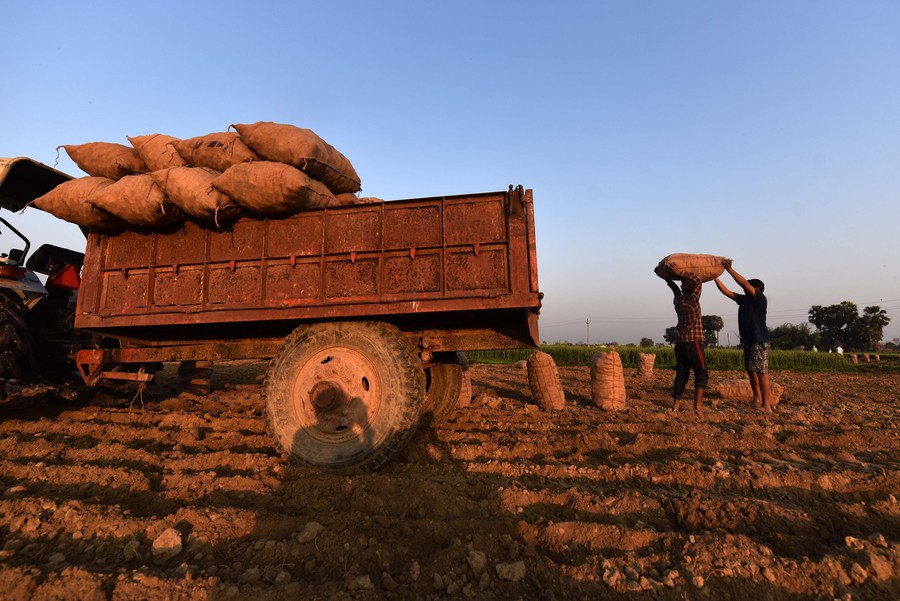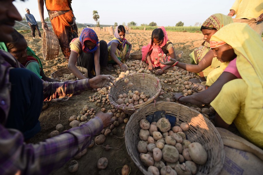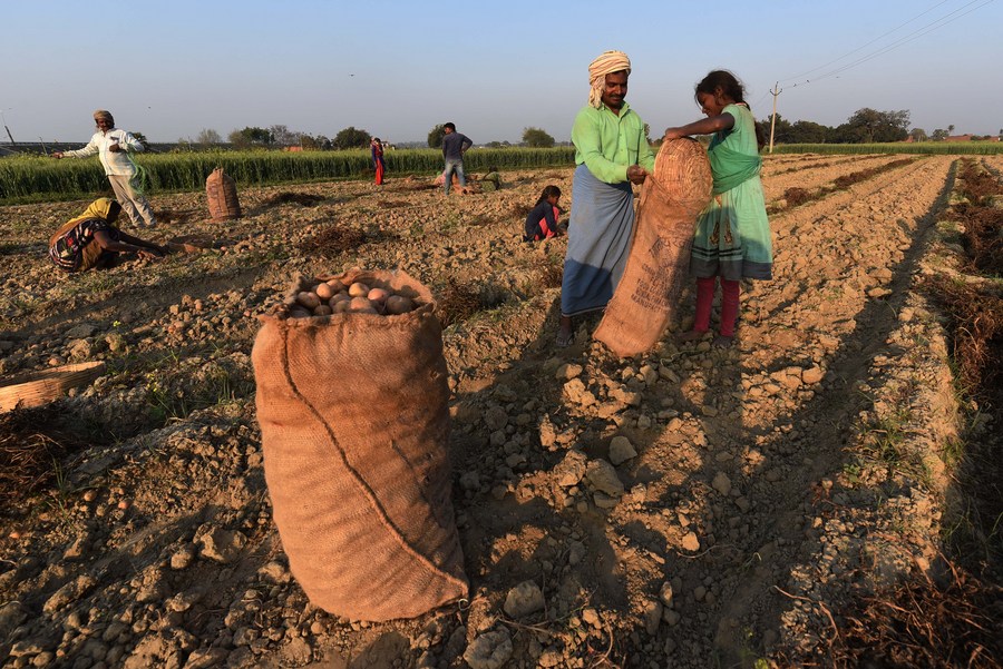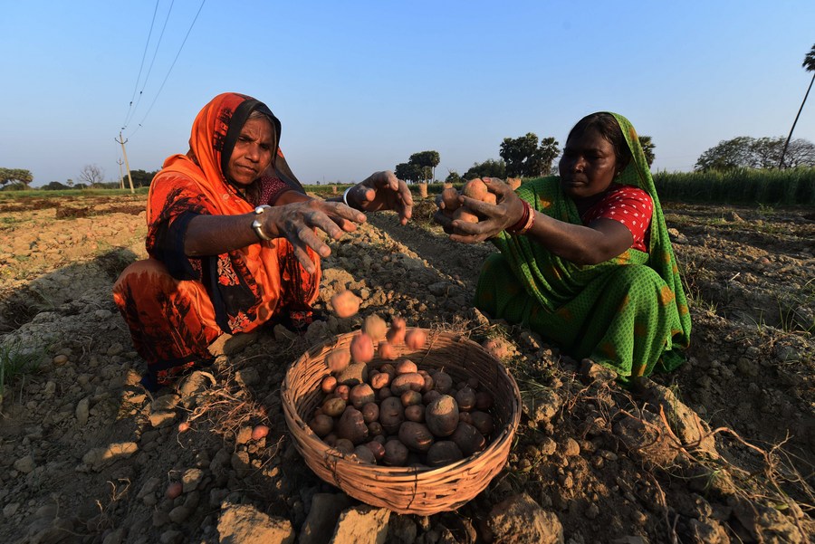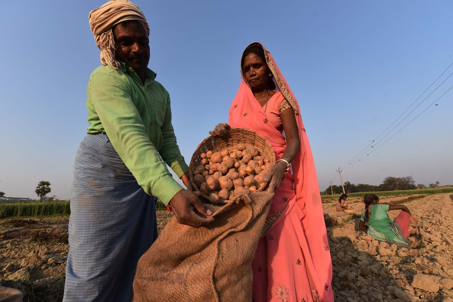 Farmers harvest potatoes in a field on the outskirts of Ghazipur district of India's northern state of Uttar Pradesh, March 2, 2022. (Xinhua/Stringer)