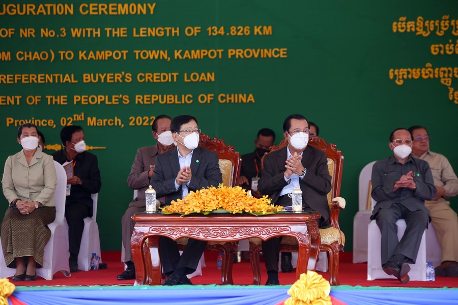 Cambodian Prime Minister Samdech Techo Hun Sen (R, front) and Chinese Ambassador to Cambodia Wang Wentian (L, front) attend the inauguration ceremony of the National Road No. 3 in Takeo province, Cambodia, March 2, 2022. (Photo by Ly Lay/Xinhua)