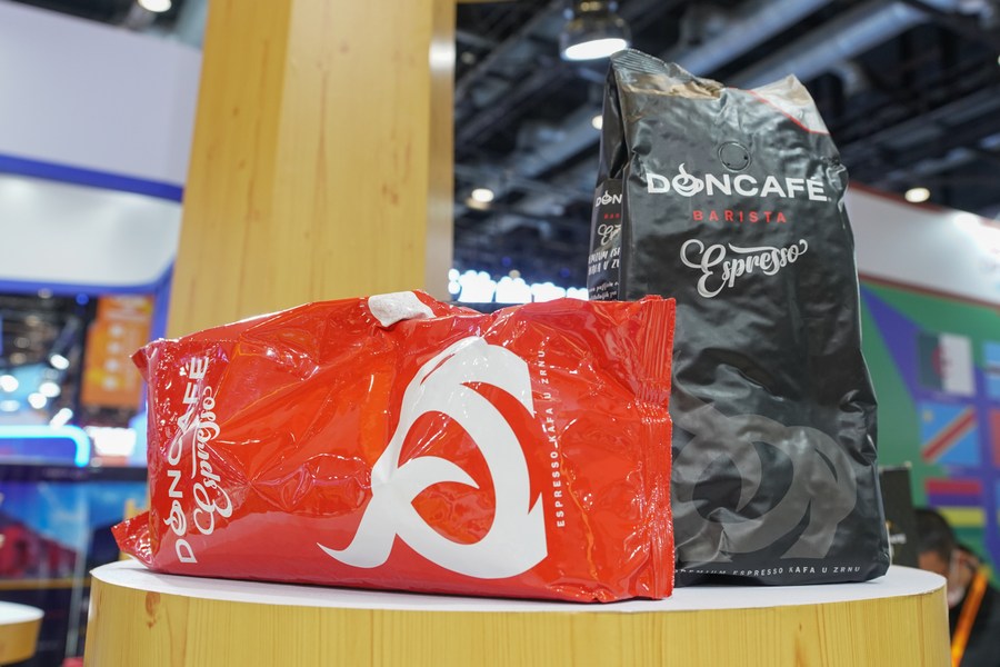 Photo taken on Sept. 5, 2021 shows the coffee bean displayed at the booth of Serbia during the China International Fair for Trade in Services (CIFTIS) in Beijing, capital of China. (Xinhua/Wang Tiancong)■